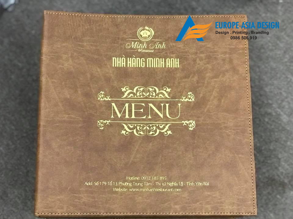Với Menu trước đây hầu như chỉ làm trên bìa và ép Plastic, ngày nay Menu được sản xuất với rất nhiều kiểu dáng, mẫu mã, chất liệu khác nhau. Nổi bật lên là chất liệu da, gáy còng inox. Bìa da thiết kế sang trọng, gia công ép nhũ hoặc ép nhiệt tùy yêu cầu của khách. Còng inox được cố định, lá ruột Menu có thể làm dời, có thể thay đổi linh hoạt nếu có sự điều chỉnh về thực đơn, tránh lãng phí và rất liện lợi.
